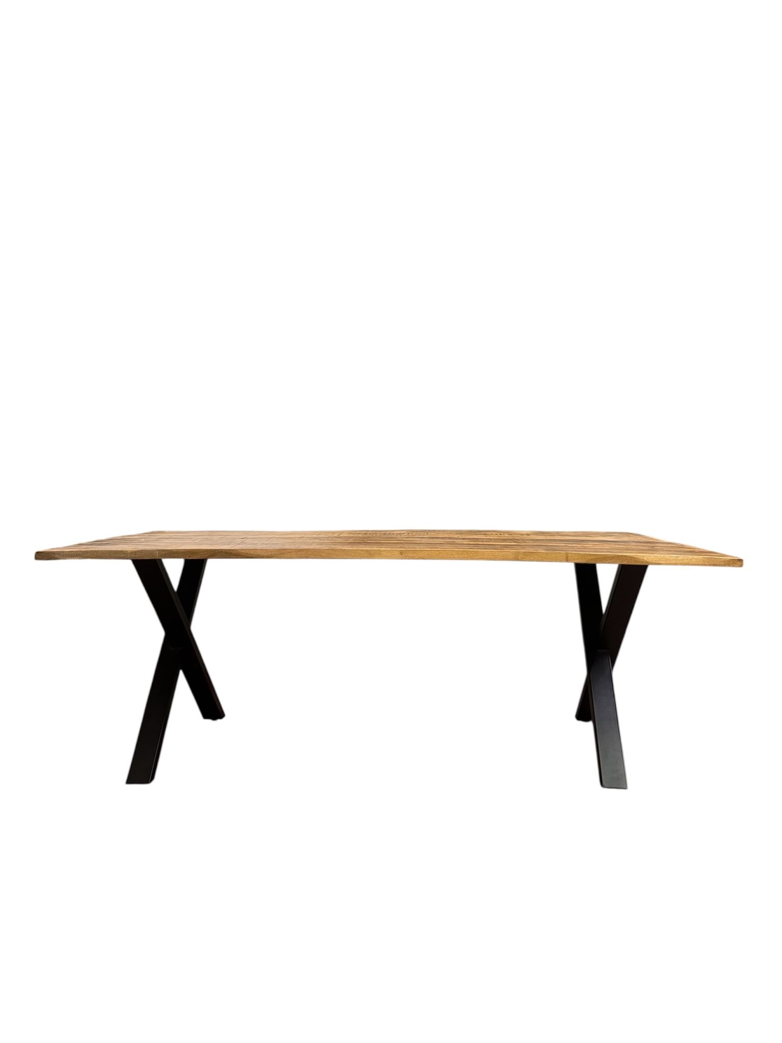 Tavolo con ripiano in legno lavorato e gambe in ferro nere.