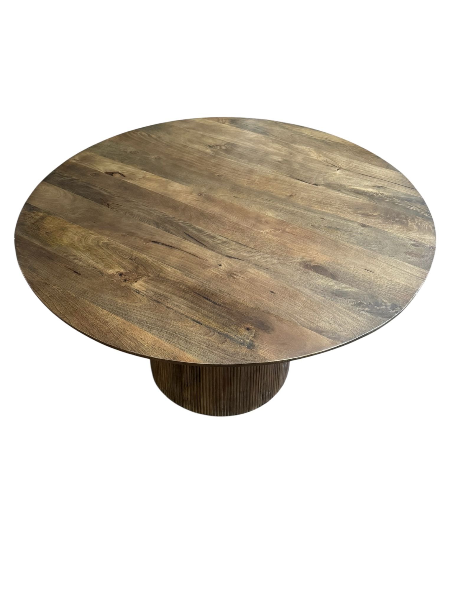 Tavolo con ripiano n legno e gamba in legno lavorato.